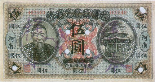 李鴻章像兌換券 伍圓 河南 正面左為李鴻章像;右為重檐八角亭圖;背面北京頤和園萬(wàn)壽山圖 藍(lán)、黑 94×176 美國(guó)鈔票公司 正面為“民國(guó)元年”背面為“1 st OCTOBER 1909”