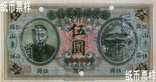 李鴻章像兌換券 伍圓 山東 正面左為李鴻章像;右為重檐八角亭圖;背面北京頤和園萬(wàn)壽山圖 藍(lán)、黑 94×176 美國(guó)鈔票公司 正面為“民國(guó)元年”背面為“1 st OCTOBER 1909”