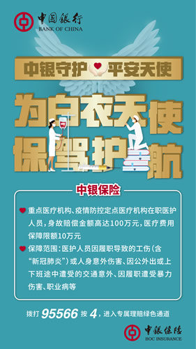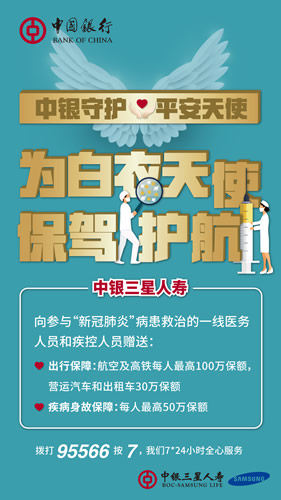 中國(guó)銀行攜旗下中銀保險(xiǎn)、中銀三星人壽兩家保險(xiǎn)公司推出“中銀守護(hù)?平安天使”抗擊疫情活動(dòng),向全國(guó)疫情防控重點(diǎn)地區(qū)的500多家醫(yī)療機(jī)構(gòu)贈(zèng)送保險(xiǎn)12萬(wàn)份,為在疫情防控一線的醫(yī)務(wù)工作者提供保險(xiǎn)保障。