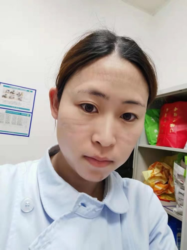 中行天津市靜海大邱莊支行員工苑少?zèng)_的愛人韓林勃,原工作于西青醫(yī)院神經(jīng)內(nèi)科,疫情爆發(fā)后,臨危受命,被組織派往西青醫(yī)院的隔離病房,沖在了防疫最前線。由于防護(hù)服數(shù)量緊張,穿脫不便,工作期間,她六個(gè)小時(shí)不能喝水進(jìn)食和上廁所。摘下口罩時(shí),露出的是被磨損的鼻梁和勒出道道紅印的臉頰;脫下手套時(shí),是發(fā)白發(fā)脹的雙手;護(hù)目鏡下是模糊的無法看清的面龐。