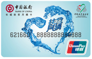 “長城-扶貧月捐”聯(lián)名卡是中國銀行與中國扶貧基金會合作發(fā)行的以“扶貧月捐”為主題的借記卡產(chǎn)品。它倡導(dǎo)“全民公益”的理念,通過公眾主動、持續(xù)、小額地參與公益慈善事業(yè),幫助貧困的弱勢群體實(shí)現(xiàn)脫貧致富、自強(qiáng)不息,從而營造平等友愛、融洽和睦的社會環(huán)境。