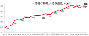 1月29日,中國銀行發(fā)佈2025年四季度跨境人民幣指數(shù)(CRI)。四季度CRI指數(shù)爲(wèi)368,較上季度上回落4點(diǎn)。