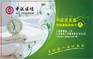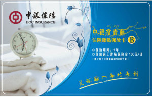 | 住院津貼保險(xiǎn)卡A | 50元/日 | 300元 | 18-55周歲 | 1年 | 《中銀保險(xiǎn)有限公司中青年住院誤工津貼保險(xiǎn)條款》 |