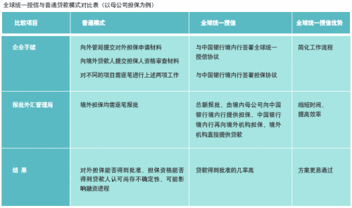 下表是在境內母公司擔保的情況下,企業(yè)境外機構在當?shù)厣暾堎J款與使用我行全球統(tǒng)一授信產品對應的操作模式的對比: