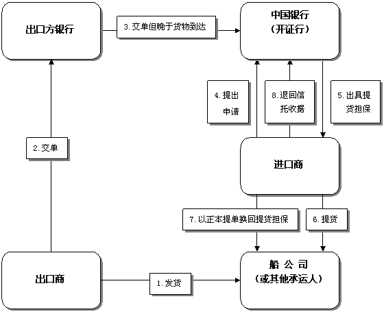 4.信用證或托收項(xiàng)下單據(jù)到達(dá)后,進(jìn)口商向我行辦理付款贖單,然后憑正本提單向船公司(或其它承運(yùn)人)換取先前出具的提貨擔(dān)保并交還我行。