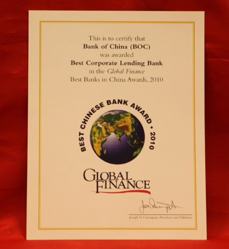 In the year 2010, Bank of China was named as "Best Corporate Lending Bank in China" by Global Finance