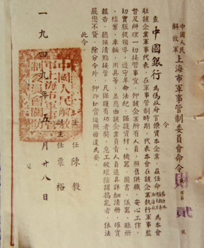 The general order on takeover of Bank of China issued by Shanghai Military Control Commission