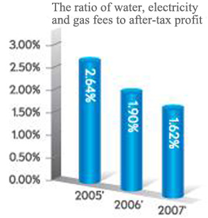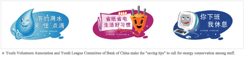 Notable progress has been made on "energy-saving and emission reduction" activity. Taking Bank of China head office for example, based on the additional office area of 3,000 square meters, 2,814 cubic meters of water and 21,283 cubic meters of gas were saved from consumption in 2007 compared with the figures of 2006. The energy consumption expenditure for after-tax profit of RMB 10,000 on average declined yearly to RMB 162 in 2007.