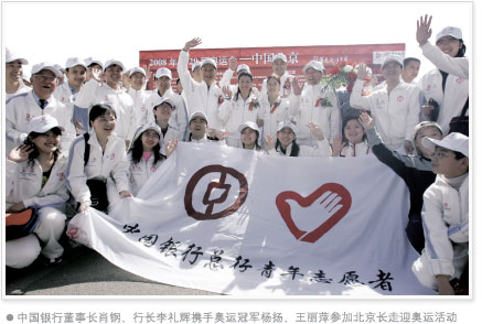 Bank of China organized such activities as the Olympic financial service month and the Olympic financial service skill contest among employees to select Olympic volunteers and spread the Olympic spirit. The bank recognized the year 2008 as the "Olympic Service Year" with a view to enhancing Olympic publicity, strengthening service awareness and improving service quality under the theme of "Serving the Olympics".