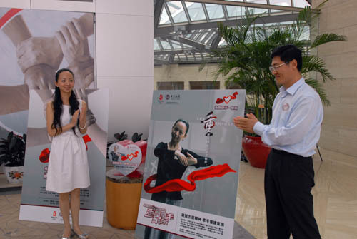Wang Yongli, Vice President of Bank of China and Chairman of the Youth Union, issues the Certificate of Image Ambassador to Tai Lihua, Director of the China Disabled People's Performing Art Troupe, who will serve as the image ambassador for this event.