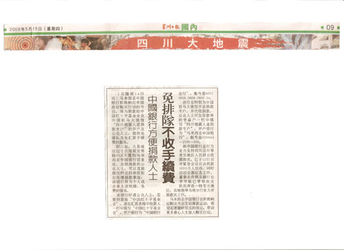 Under the guidance of the head office, Bank of China overseas branches offered fee-free "Green Channel" remittance services for the disaster relief. Bank of China (Malaysia) Berhad put up announcements in its outlets to inform the public of Sichuan earthquake and provided convenient queue-free, fee-free remittance services to facilitate the donations.