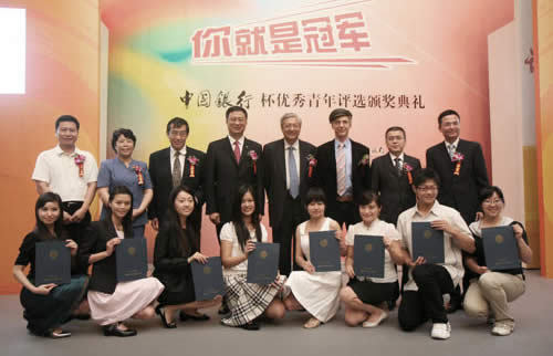 Mr. Li Lihui, President of Bank of China, Mr. Xu Zhihong, then-Principle of Peking University and Professor Alan Snyde from the University of Sydney, the founder of Olympic Champion Forum, taking picture with the representatives of outstanding youths