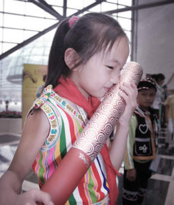 Picture on the left: a kid of ethnic minority kissing the Olympic torch
