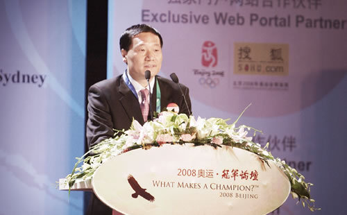 Mr. Xiaogang, Chairman of Board of Directors of Bank of China, giving a speech at the Olympic Champion Forum.