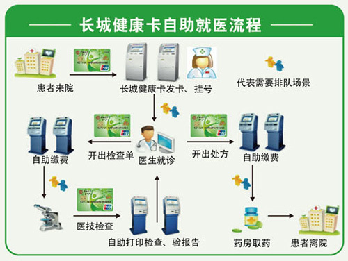 以下以持長城健康卡就診為例對自助就醫(yī)流程進行展示,包括自助辦卡、自助掛號、自助繳費、自助打印、自助退款、自助充值等環(huán)節(jié),具體如下: