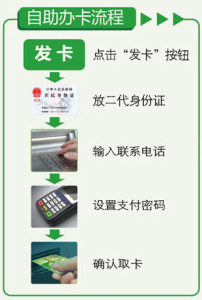 1、請在“自助發(fā)卡機”上辦理此業(yè)務(wù),辦卡時必須刷二代身份證,若持有一代身份證請去人工窗口或銀行柜臺辦理。