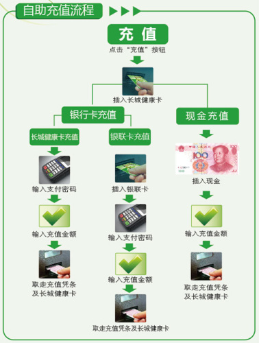 1、此流程適用于長城健康卡附帶的醫(yī)院預(yù)交金賬戶充值業(yè)務(wù),若長城健康卡金融賬戶充值,請去自助發(fā)卡機或存取款一體機。